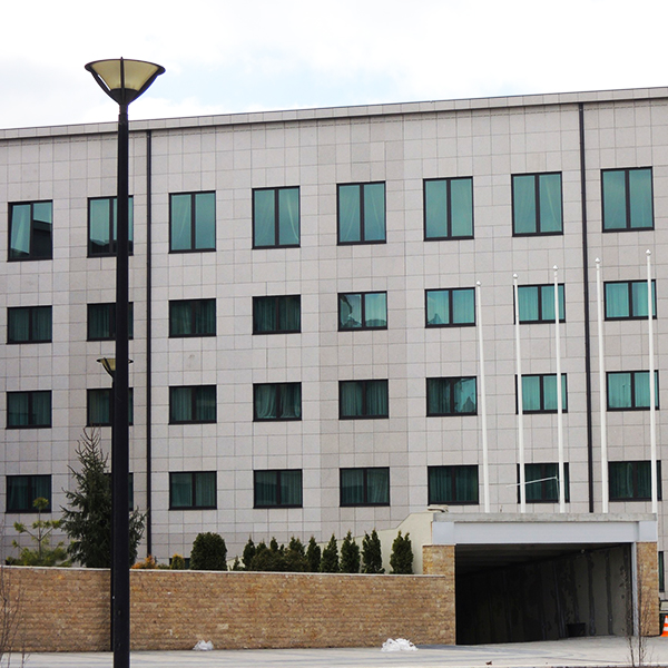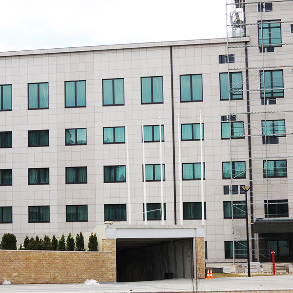 Montaža fasadnih termoizolacionih panela na armirano betonskom platnu sa sekundarnom čeličnom potkonstrukcijom i završnom oblogom od granitnih ploča (ventilirajuća fasada).