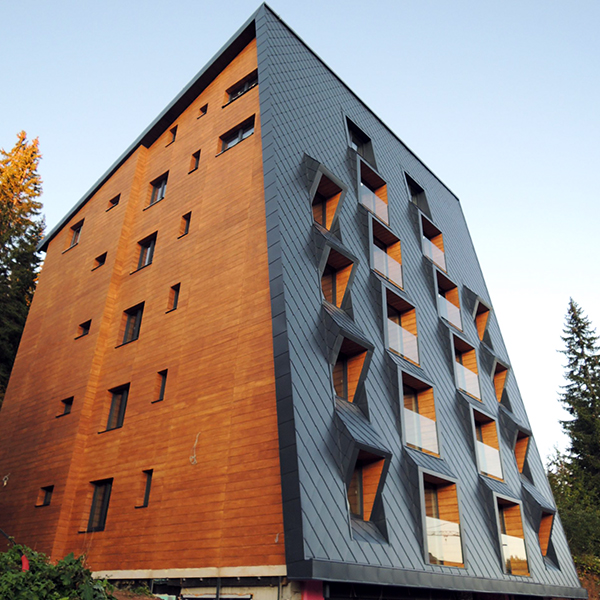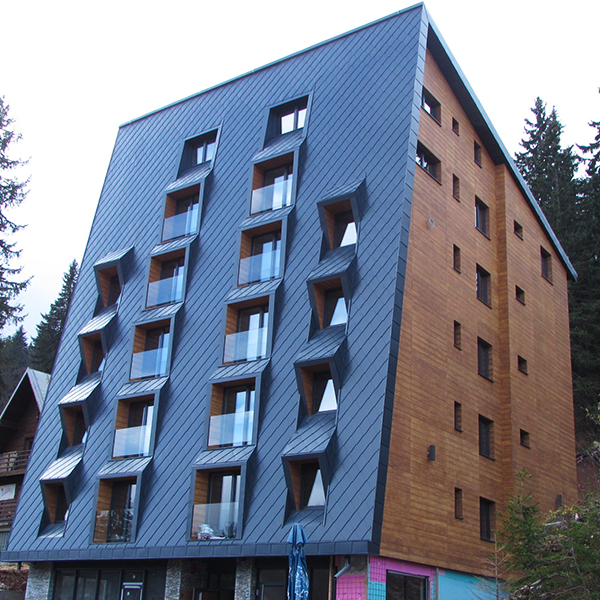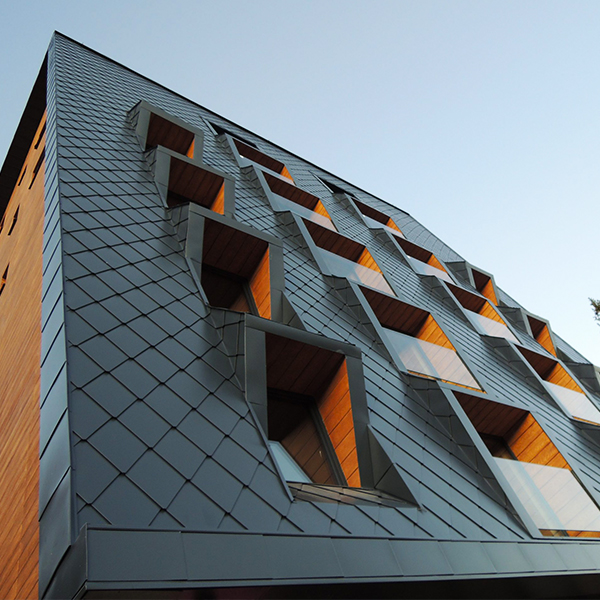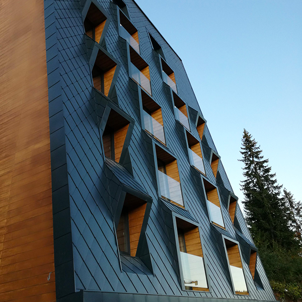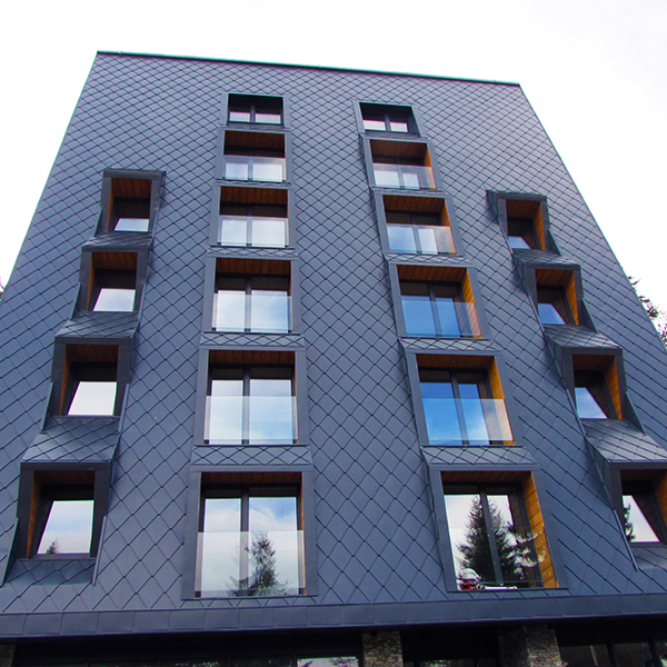 Fasadna obloga od romboidnih pločica – šifera od aluminijumskog bojenog plastificiranog lima debljine 0,8mm predviđena za ravni čiji je ugao veći od 20 stepeni.