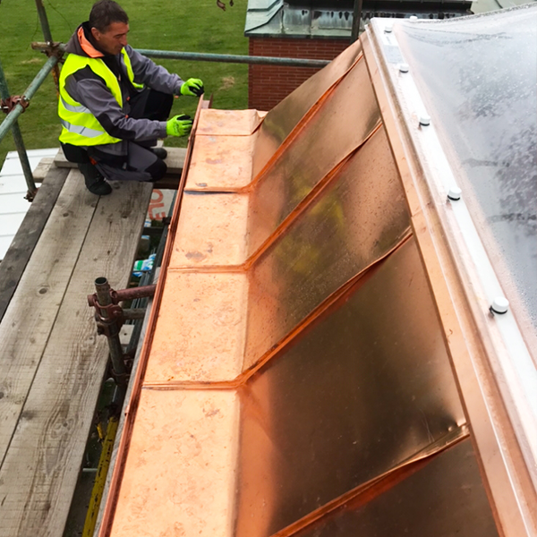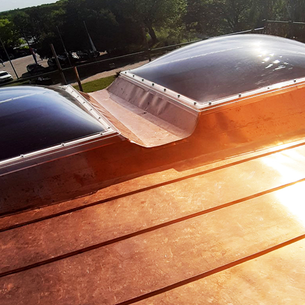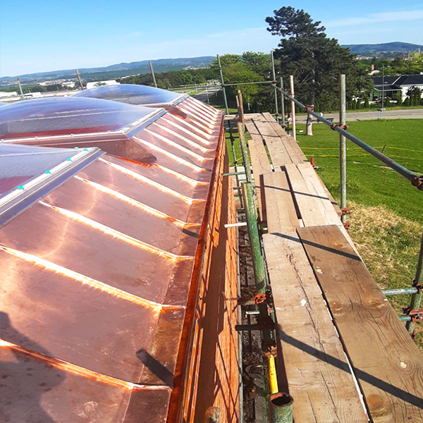 Izrada i montaza krovnog pokrivaca u sistemu duplog stojeceg falca od bakarnog lima, na objetku su radjeni svi tesarski pripremni radovi, bravarski radovi-izrada i montaza nasadnih venaca i montaza krovnih kupola na njih,